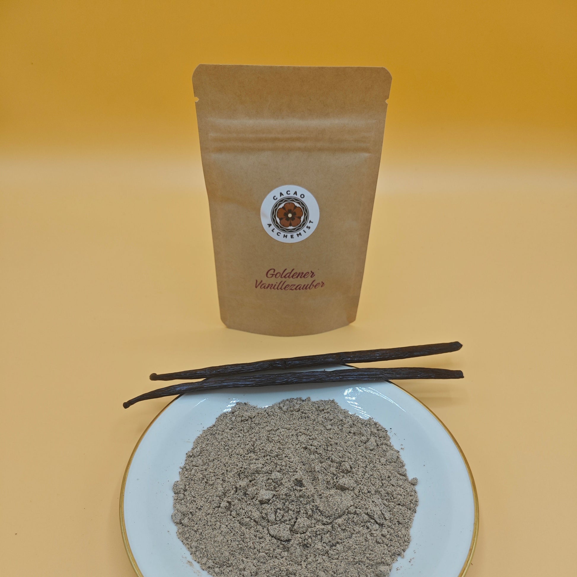 Für den Goldenen Vanillezauber werden die Schoten vollständig getrocknet, schonend vermahlen und fein gesiebt. Nichts wurde extrahiert. Nichts entfernt. Die ganze Vanille ist enthalten – Frucht, Samen, Hülle und ihr volles Wesen.
